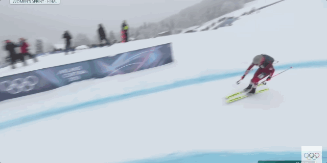 选手穿着贴皮雪板进行高强度推进。贴皮依靠纤维的各向异性摩擦特性实现“前滑顺畅、后滑受阻”。高水平选手的步频极为稳定,雪板抬离雪面的高度被控制在最低限度,以减少能量浪费,所以这个阶段运动员看起来像是在跑步或者竞走。